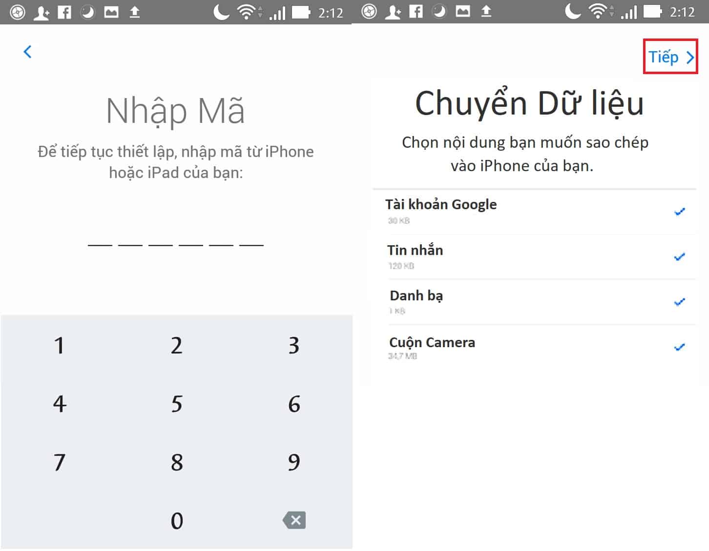 - Nhập mã xác nhận trên điện thoại Android, chọn dữ liệu muốn chuyển nhấn Tiếp. Sau khi quá trình hoàn tất nhấn Xong trên thiết bị Android.