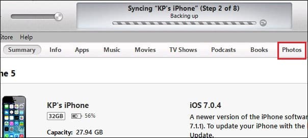 - Kết nối iPhone với máy tính và kích hoạt iTunes lên. Từ giao diện chính của iTunes, bấm nút Photos ở góc ngoài bên phải.