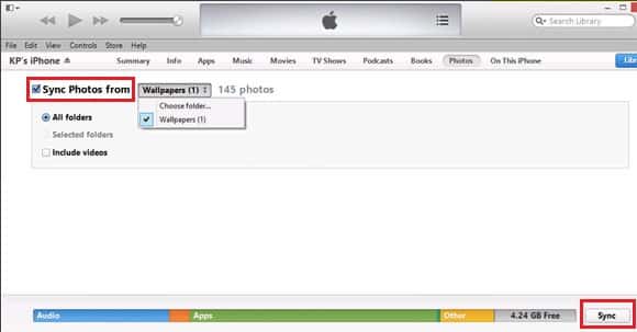 - Kích vào Sync Photos from, rồi chọn thư mục trên máy tính có chứa các file ảnh đã được chuyển từ điện thoại Android sang. Bấm nút Sync ở góc dưới bên phải và tất cả các hình ảnh từ thư mục được chọn sẽ được chuyển sang iPhone.
