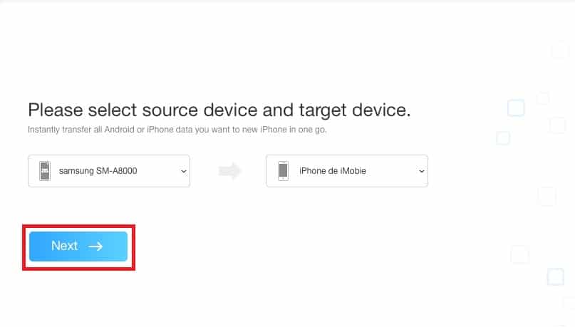 - Chọn điện thoại Android nguồn và iPhone làm điện thoại mục tiêu, sau đó bấm Next.