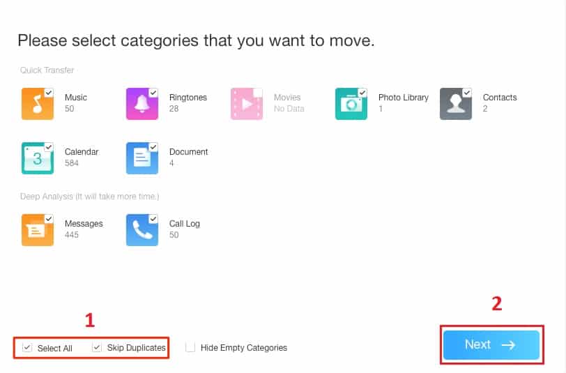 - Tất cả các danh mục có thể được chuyển sang iPhone sẽ được liệt kê bên dưới, tick vào các dữ liệu mà bạn muốn chuyển và nhấn Next.