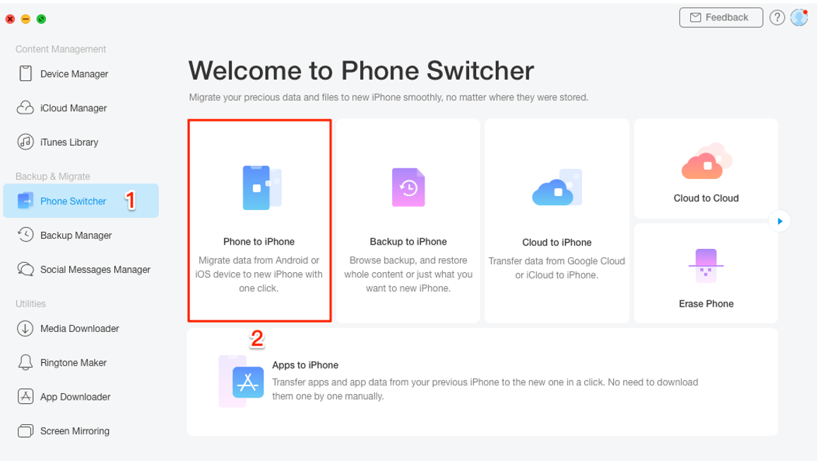 - Sau khi tải xuống và cài đặt AnyTrans trên máy tính hoặc mở qua trình duyệt, chọn Phone Switcher > Phone to iPhone.