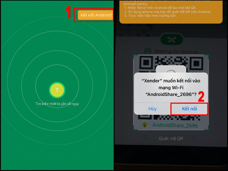 - Mở Xender trên iPhone nhấn vào Receive (Nhận), ứng dụng sẽ mở camera, bạn chỉ cần quét mã vừa xác nhận trên Android và bấm Kết nối.