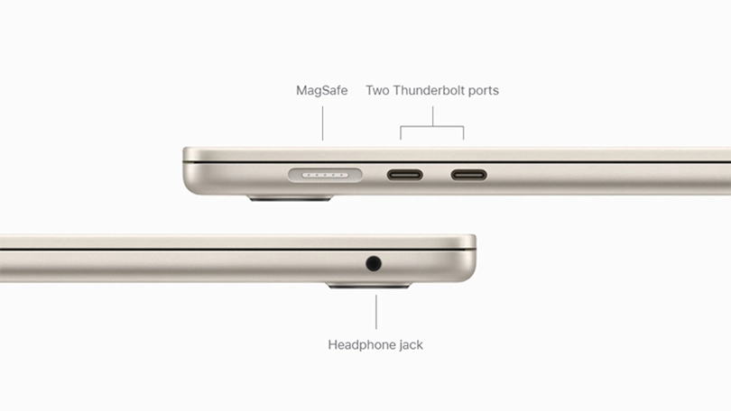 Macbook Air 15 inch M2 2023 cũng sẽ sở hữu 1 cổng sạc Magsafe, 2 cổng Thunderbolt, 1 jack 3.5 để cắm tai nghe tương tự như thế hệ MacBook Air 13 inch M2 2022 trước đó nhưng được cải tiến về mặt thông số và tốc độ truyền. Jack cắm tai nghe 3,5 mm có hỗ trợ nâng cao cho tai nghe trở kháng cao.