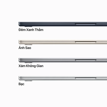 MacBook Air 15″ bao gồm 4 phiên bản màu: Đêm xanh thẳm Midnight, Vàng ánh sao Starlight, Xám không gian Space Gray, và Màu bạc Silver. Apple cũng công bố đây là chiếc laptop mỏng nhất ở thời điểm hiện tại của nhà Táo. Sở hữu độ mỏng chỉ 11.5 mm và cân nặng 1.51 kg giúp bạn thuận tiện đem theo bên mình.