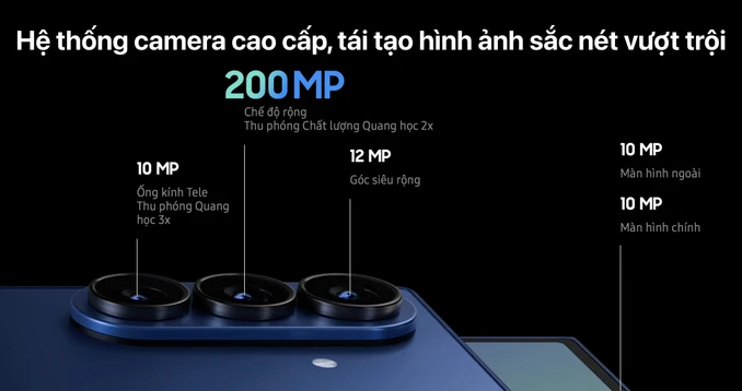 Camera sau: 200 MP, F1.7 + 12 MP, F2.2 + 10 MP, F2.4, Camera trước: 10MP, F2.2